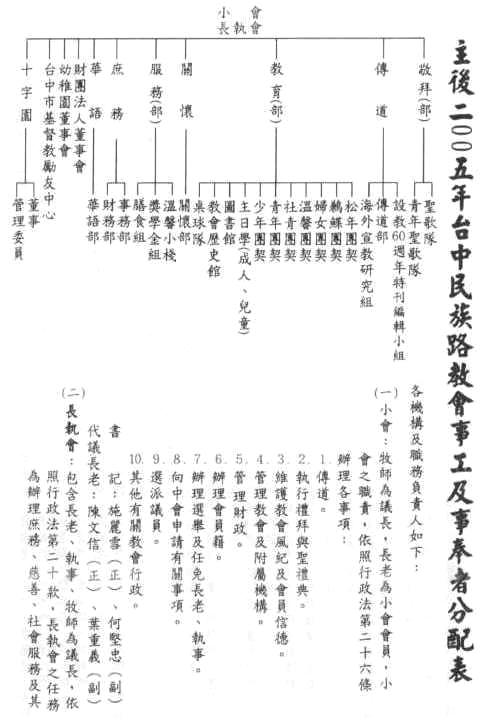 教會行政組織的簡介... 主後2005年台中民族路教會事工及事奉者分配表